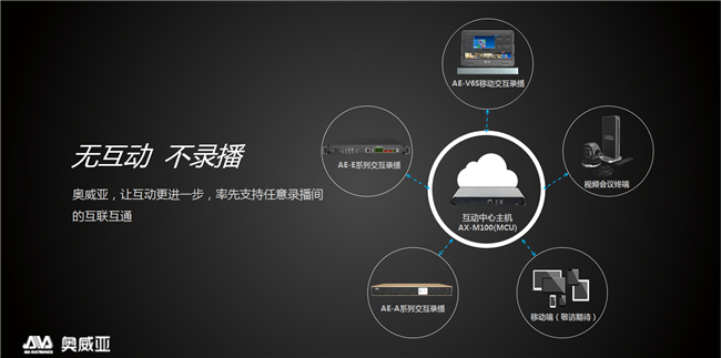 如今,奧威亞的任意系列錄播設(shè)備均可實現(xiàn)互動,同時我們只需添加奧威亞自主研發(fā)的MCU互動中心主機,即可實現(xiàn)第三方視頻會議終端、任意品牌錄播設(shè)備之間有效的互聯(lián)互通。真正打破了錄播互動原有的技術(shù)界限!