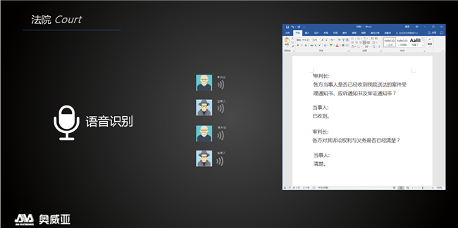 奧威亞智能語音庭審記錄運用科技的力量,可以智能記錄庭審的語音全過程,庭審筆錄自動生成,減輕書記員的工作壓力。讓庭審人員能夠更專注于庭審內(nèi)容,提高法院庭審質(zhì)效。