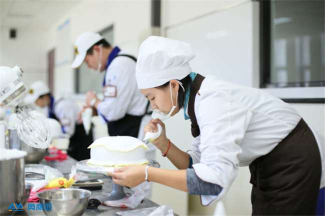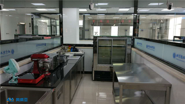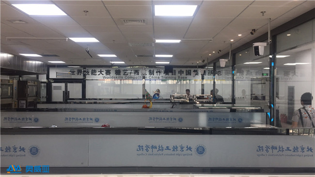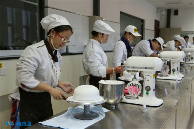 其實,用于比賽的糖藝西點實訓室只是北京輕工技師學院門頭溝教學區(qū)眾多實訓室的其中一間。門頭溝教學區(qū)是華北地區(qū)規(guī)模最大的西點西餐培訓基地,建有21間教、學、做一體化實訓教室,包括食品烘焙實訓室、西餐實訓室、裱花實訓室、咖啡實訓室、翻糖實訓室等等,其中有18間是奧威亞為該教學區(qū)量身打造完成的。