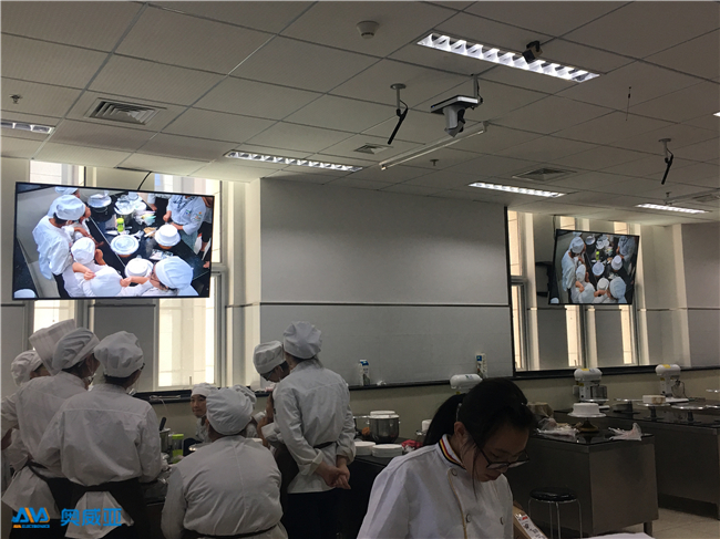 實訓基地主要供學生學習、訓練西點西餐制作技能使用。老師只需站在帶有奧威亞全高清云臺攝像機的工位上進行示范操作,學生們就可以通過課室里的高清大屏方便地觀看與學習,而不需要里三層外三層地圍著老師。這種做法,避免了傳統(tǒng)實訓中因場地、人數(shù)等限制因素而產生的教學質量下降的問題。