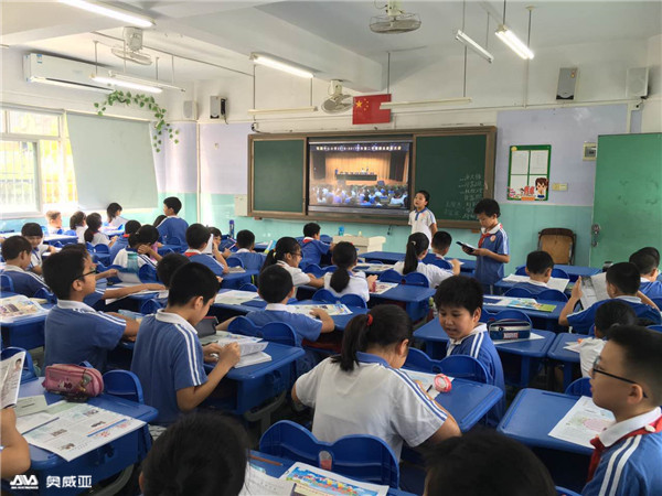 那么,如何讓其他未能到場的學(xué)生也能看到這次表彰大會呢?深圳觀瀾中心小學(xué)在錄播廠家奧威亞的協(xié)助下,利用教育信息化的技術(shù)優(yōu)勢,進(jìn)行了現(xiàn)場直播。通過奧威亞的移動錄播V6和教學(xué)視頻應(yīng)用云平臺,其他老師和學(xué)生在自己的教室就可以看到大會現(xiàn)場的情況。